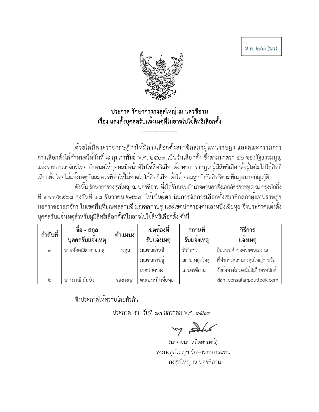 ประกาศ รักษาการกงสุลใหญ่ ณ นครซีอาน เรื่อง แต่งตั้งบุคคลรับแจ้งเหตุที่ไม่อาจไปใช้สิทธิเลือกตั้ง